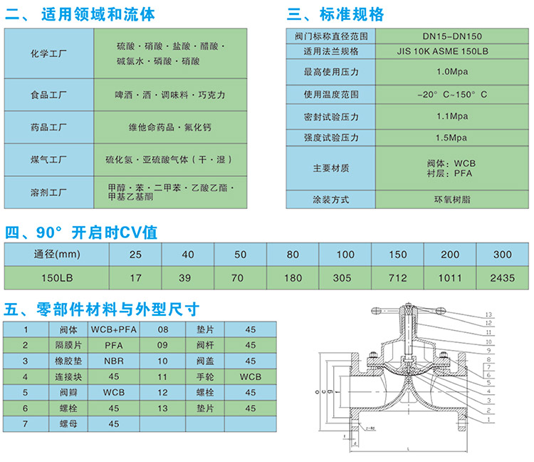 襯氟隔膜閥是一種特殊形式的具有截斷功能的閥門。襯氟隔膜閥與其它閥門大的區(qū)別在于:采用無填料函的構(gòu)造;襯氟隔膜閥隔膜可使流道內(nèi)的腐蝕性介質(zhì)與所有驅(qū)動部件處於完全隔離的狀態(tài),從而杜絕了通常閥門的“跑、冒、滴、 孺”等弊端。在化工、制酸、制堿、冶煉、稀土、農(nóng)藥等行業(yè)生產(chǎn)系統(tǒng)中應(yīng)用較為廣泛。
