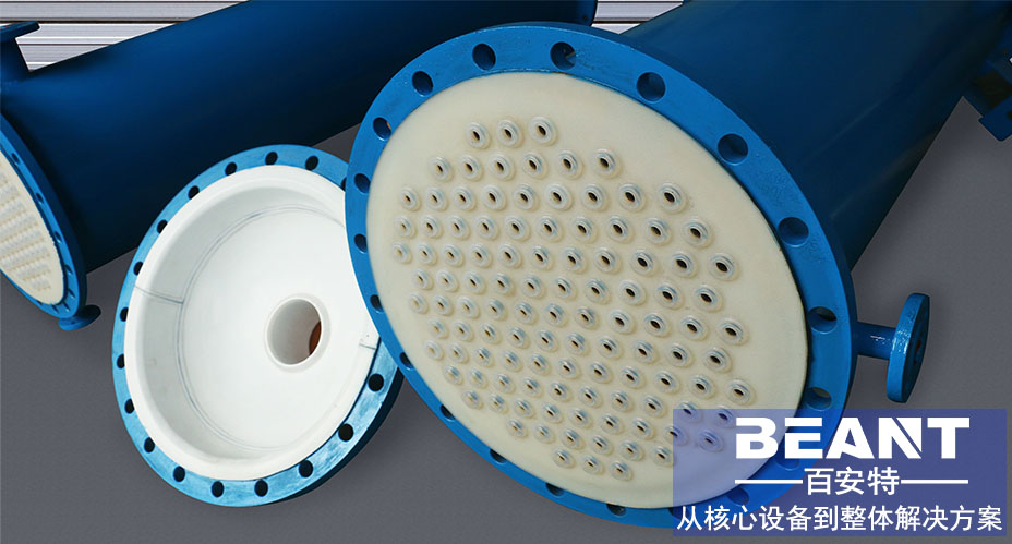 由于管殼式換熱器采用的是薄壁管,壁厚僅有0.6mm~1mm,所以克服了氟塑料導熱系數低的缺點,使其總傳熱系數可達150-300(W/m2K),熱交換率高達95%。